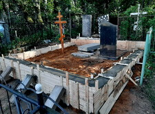 Затем наступил самый ответственный этап работы: монтаж ограждение. Работа по его установке опять-таки заняла достаточно долгое время, однако в результате чего по периметру могилы была установлена достаточно высокая статусная металлическая ограда, сразу же выделяющая место захоронения на фоне других участков. На фотографиях ниже представлен окончательный внешний вид могилы с разных ракурсов на момент завершения работ.